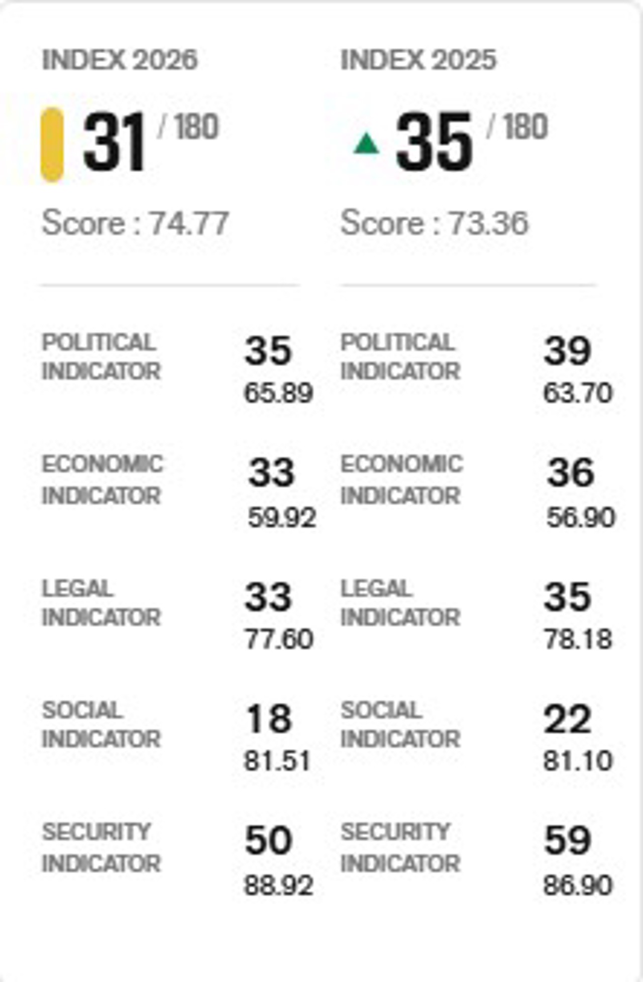 In the report, the Republic of Moldova achieved its highest score in the "Social Indicator" category, ranking 18th out of 180 countries, while it received its lowest score in the "Security Indicator " category, ranking 50th.