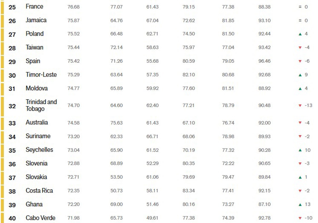 Countries like Russia, which is engaged in a war against Ukraine, and Iran occupy low positions in the rankings.