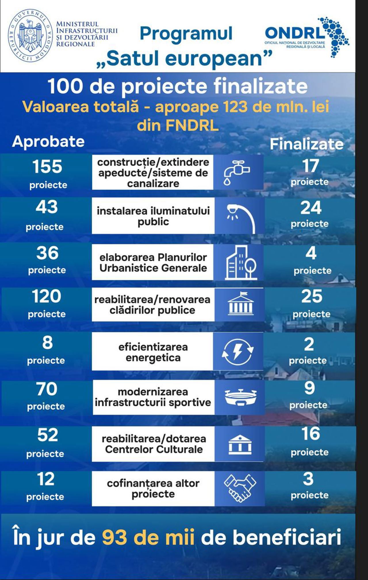 Valoarea maximă a unui proiect care poate fi aprobat constituie 10 milioane de lei. În total, au fost selectate pentru finanțare 492 de proiecte, ale căror realizare va costa aproximativ 2 miliarde de lei, bani alocați din Fondul Național pentru Dezvoltare Regională și Locală.