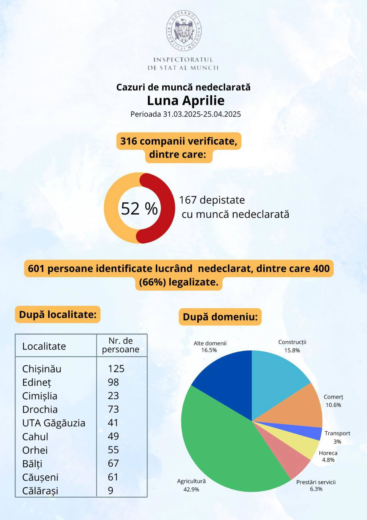 Inspectoratul de Stat al Muncii a identificat, în luna aprilie, peste 600 de persoane care activau fără un contract individual de muncă. Cazurile au fost descoperite în urma controalelor desfășurate la 316 companii din întreaga țară. La 167 dintre acestea au fost constatate nereguli legate de munca nedeclarată.