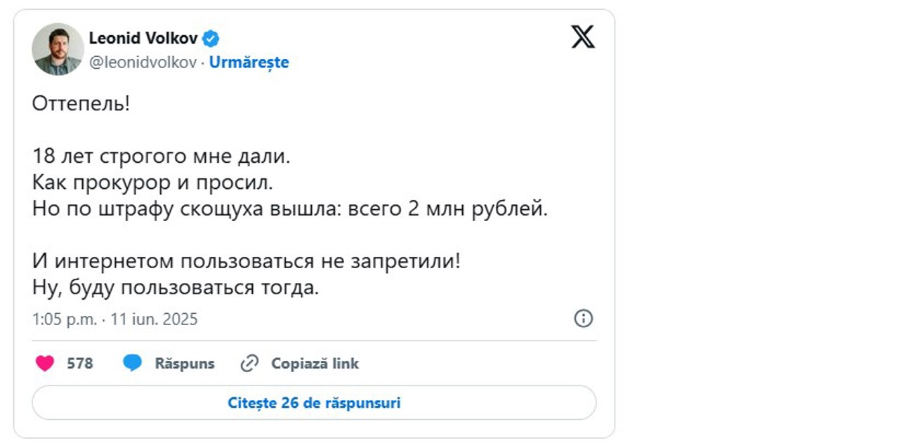 „Mi-au dat 18 ani de regim strict. Exact cât a cerut procurorul. Dar amenda a primit o reducere: doar 2 milioane de ruble. Și nu mi-au interzis să folosesc internetul! Ei bine, atunci îl voi folosi”, a scris Leonid Volkov.