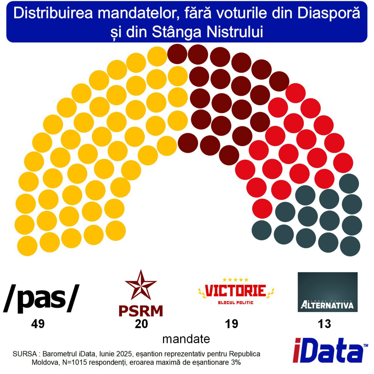 A survey conducted by iData, released on June 30, indicates that the Party of Action and Solidarity (PAS) would get the most seats – 49 – out of a total of 101. Following them would rank the Party of Socialists (PSRM), the "Victory" Political Bloc, and the "Alternativa" Bloc.