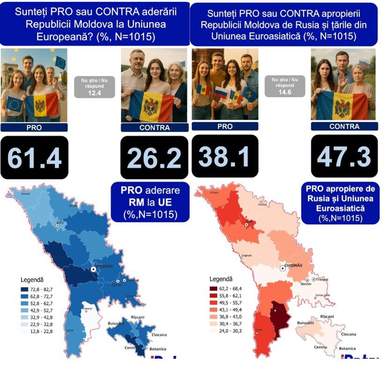 The highest percentages of support for EU accession are recorded in the Center-South region and Chișinău municipality, where in some districts, the percentage exceeds 72%.