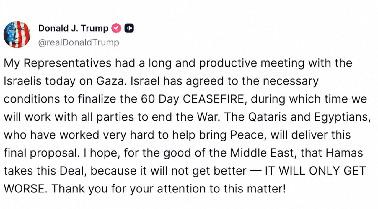 Într-un mesaj postat pe rețeaua Truth Social, liderul de la Casa Albă afirmă că, în această perioadă, SUA vor colabora cu toate părțile implicate pentru a pune capăt conflictului. Deocamdată, Israelul nu a confirmat oficial că a acceptat condițiile propuse, iar din partea Hamas nu a existat niciun comentariu imediat, chiar dacă anterior, un lider al grupării, a declarat că ar accepta orice propunere care duce la încetarea definitivă a războiului.