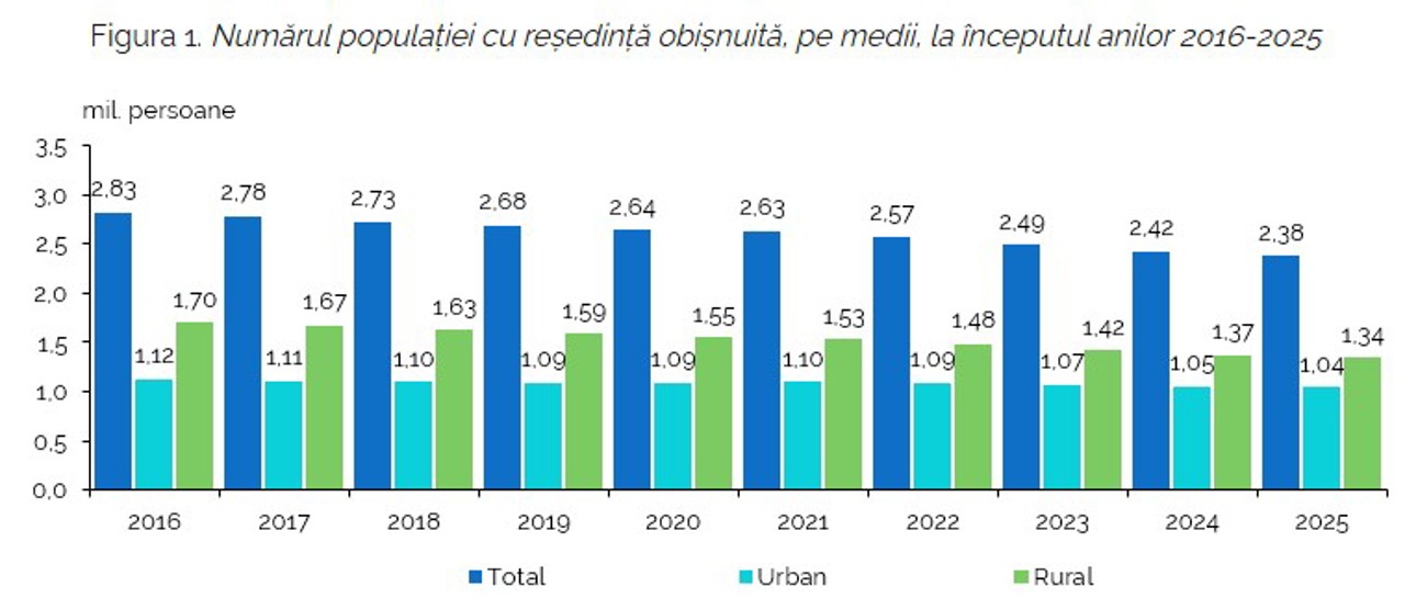R. Moldova pierde constant din numărul populației. Pe 1 ianuarie 2025, în R. Moldova erau 2,381 de milioane de persoane cu reședință obișnuită, cu peste 42.000 mai puțin sau 1.7% decât în anul precedent. Datele Biroului Național de Statistică (BNS), care nu includ și teritoriul din stânga Nistrului, arată că, începând cu 2016, populația R. Moldova a scăzut cu 450 de mii de persoane.