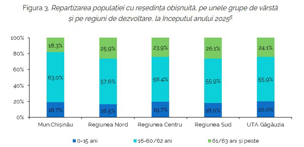 Structura populației după grupe de vârstă pe regiuni este relativ uniformă, cu excepția municipiului Chișinău și a UTA Găgăuzia. În municipiul Chișinău, ponderea persoanelor în vârstă aptă de muncă (16-60/62 ani) este cea mai mare, iar ponderea persoanelor vârstnice (61/63 ani și peste) este cea mai mică.