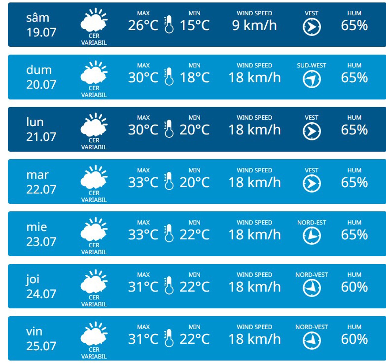 Sâmbătă ziua, temperaturile vor oscila între 23 și 28 de grade Celsius. De duminică, temperaturile vor crește treptat pe timp de zi și vom avea până la 32 de grade.