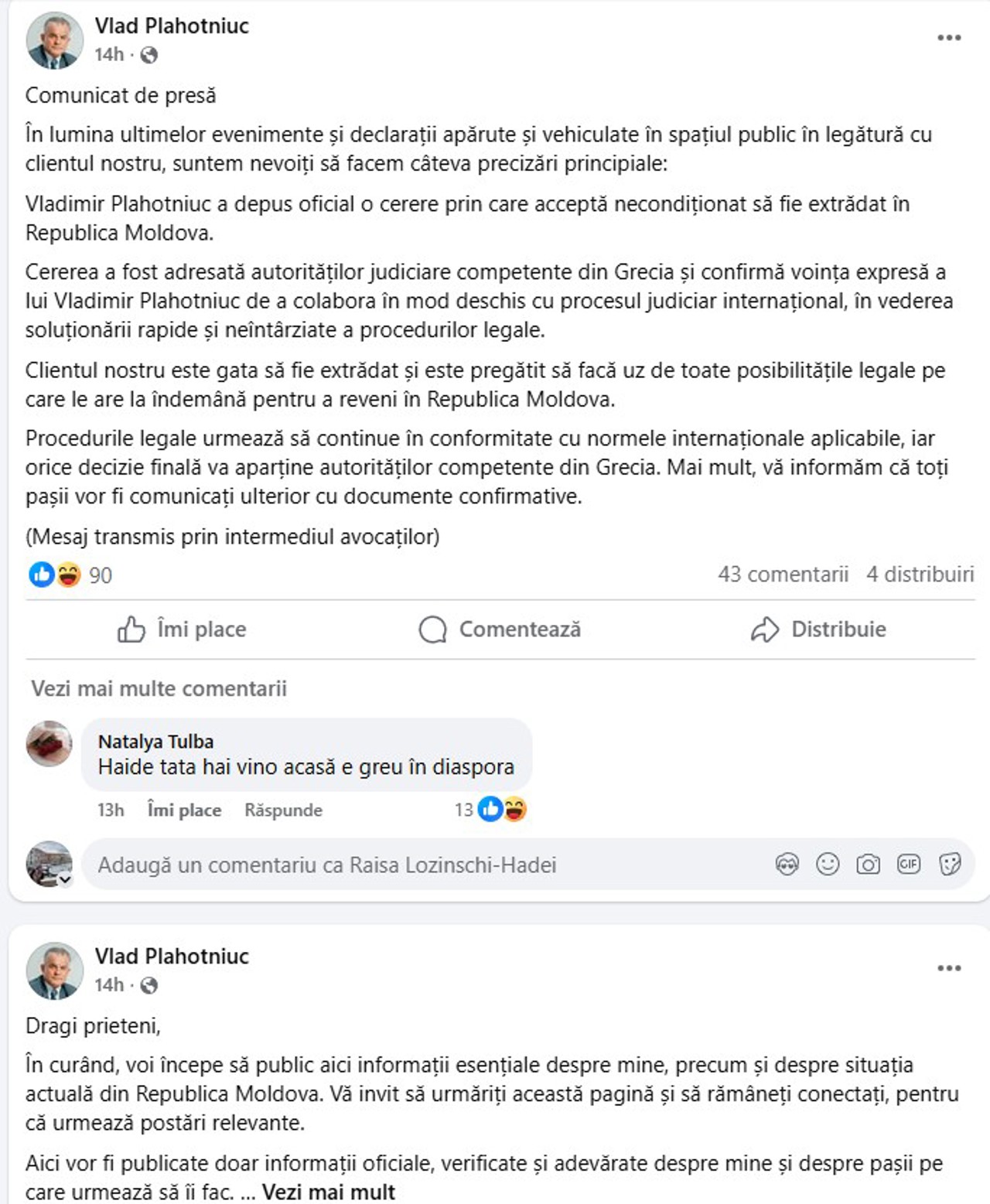 Пост сопровождается уточнением, что сообщение «передано через адвокатов». Во втором сообщении, отмечается, что «Владимир Плахотнюк официально подал запрос, в котором соглашается на экстрадицию в Республику Молдова».