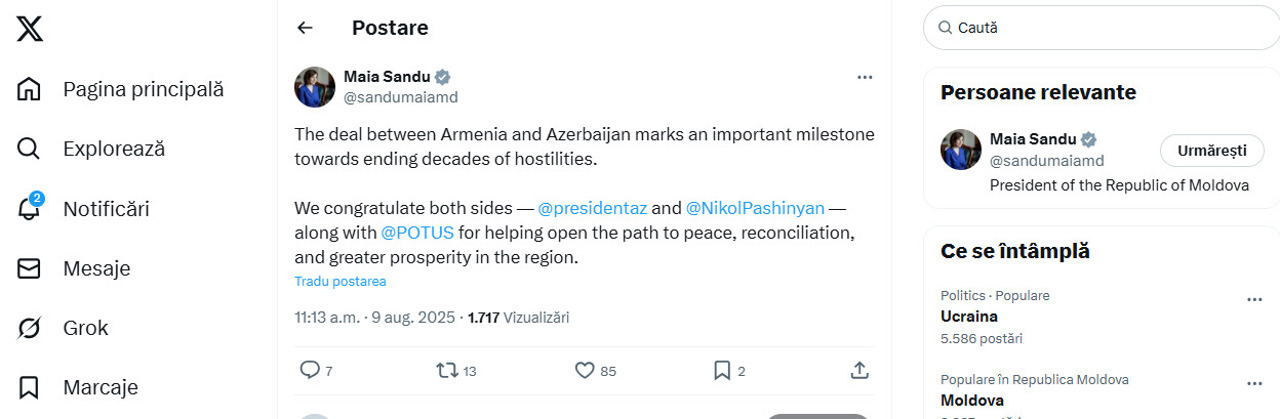 Глава государства Майя Санду приветствовала соглашение о мирных отношениях, подписанное президентом Азербайджана Ильхамом Алиевым и премьер-министром Армении Николом Пашиняном в пятницу, 8 августа в Белом доме.