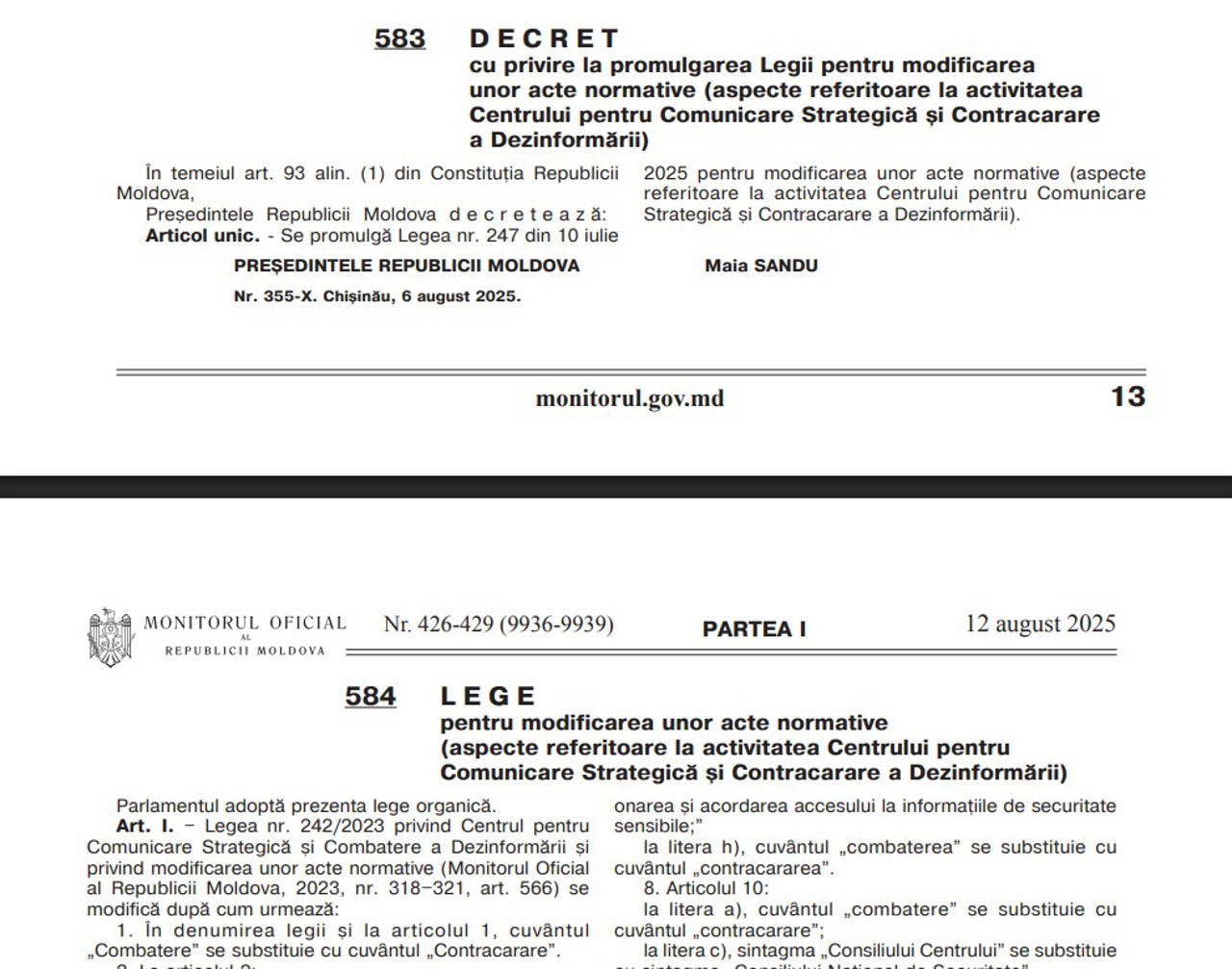С 12 августа Центр стратегической коммуникации и противодействия дезинформации переходит в подчинение Аппарата президента. Указ главы государства о промульгировании поправок, внесенных парламентом, опубликован в «Официальном мониторе». Директора организации будет назначать и освобождать от должности глава государства.