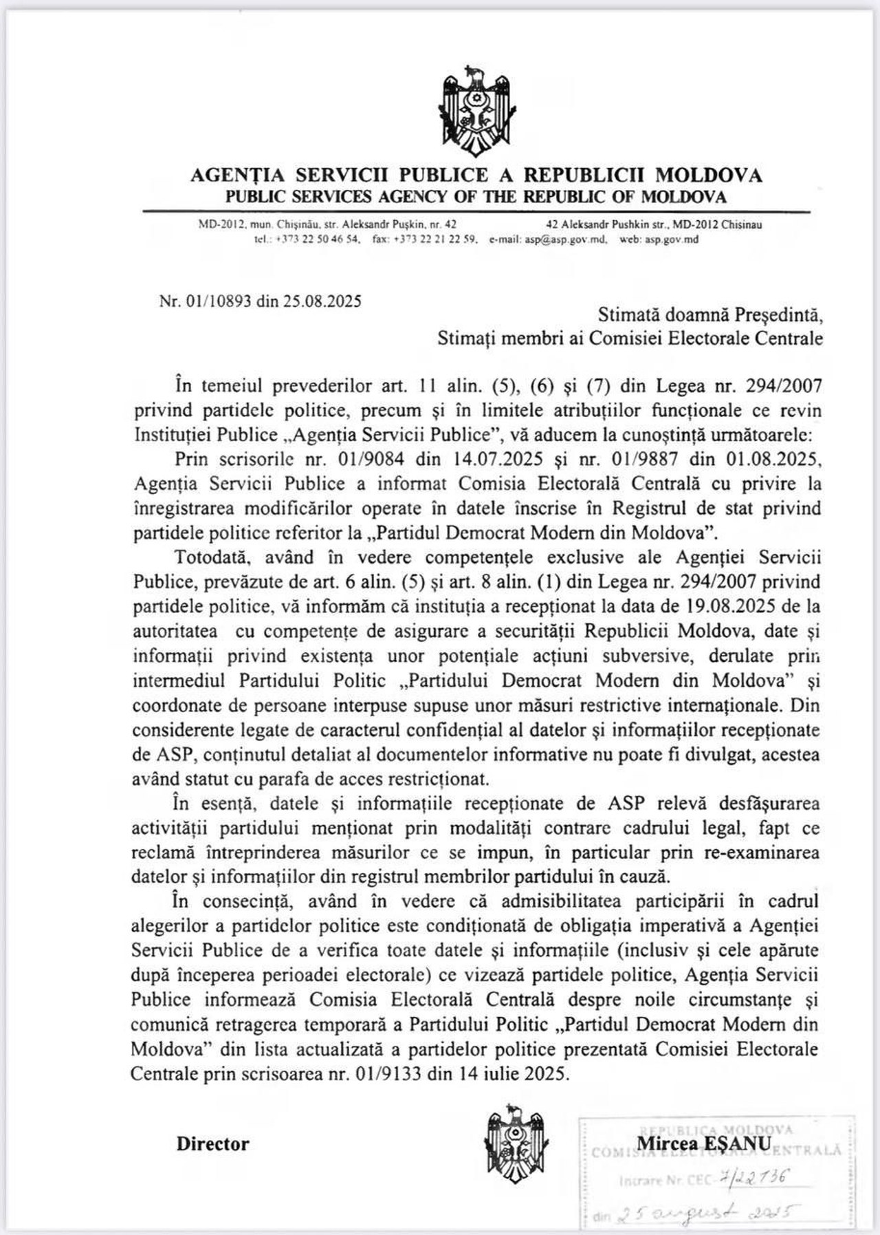 Агентство государственных услуг Молдовы (АГУ) временно исключило партию «Современная демократическая партия Молдовы» (СДПМ) из списка политических формирований, допущенных к парламентским выборам 28 сентября. Об этом сообщается в официальном письме, направленном 25 августа в Центральную избирательную комиссию (ЦИК).