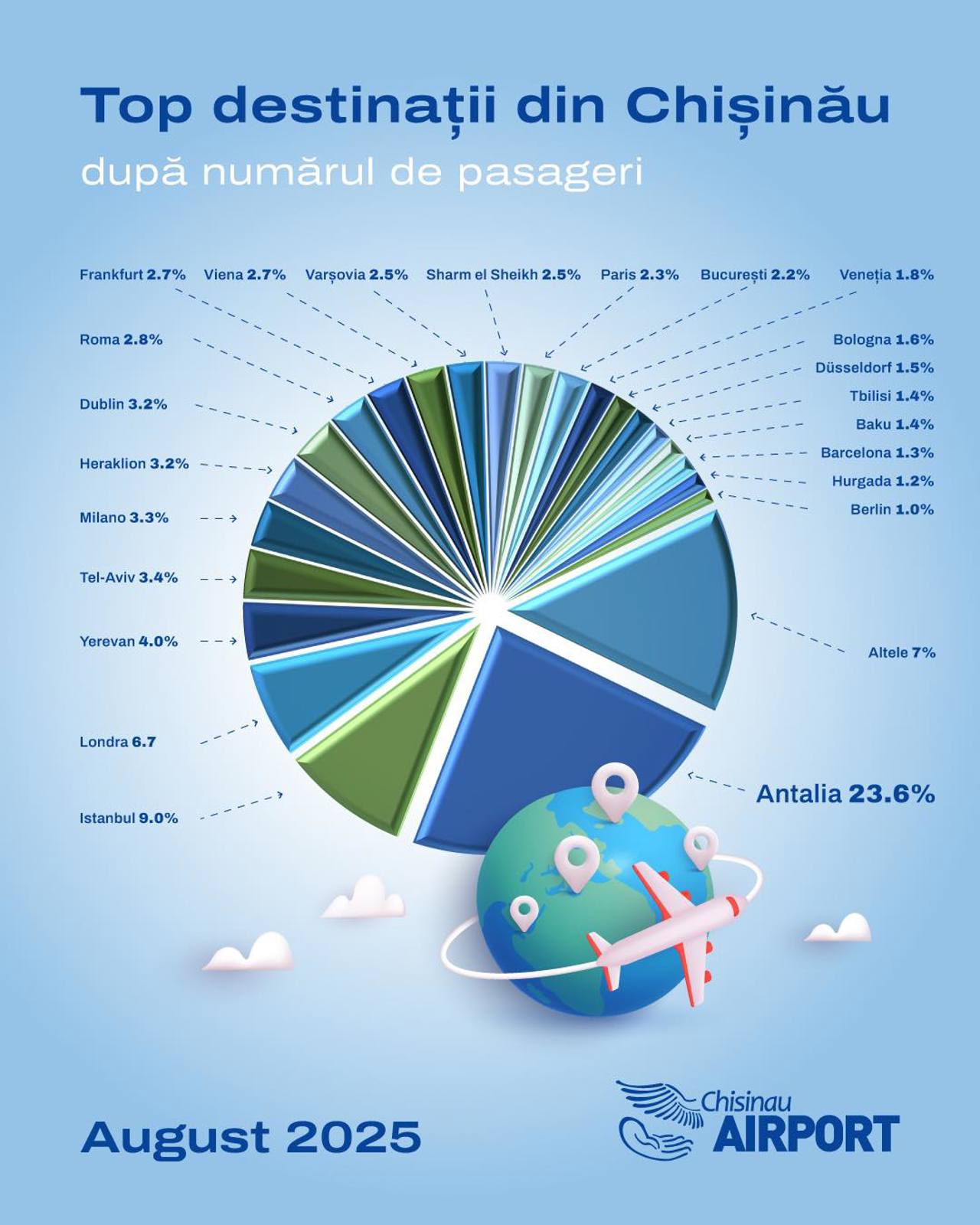 Luna august reconfirmă potențialul Aeroportului Internațional Chișinău de a conecta Republica Moldova cu principalele huburi europene și destinații turistice de top”, se arată în comunicatul instituției.