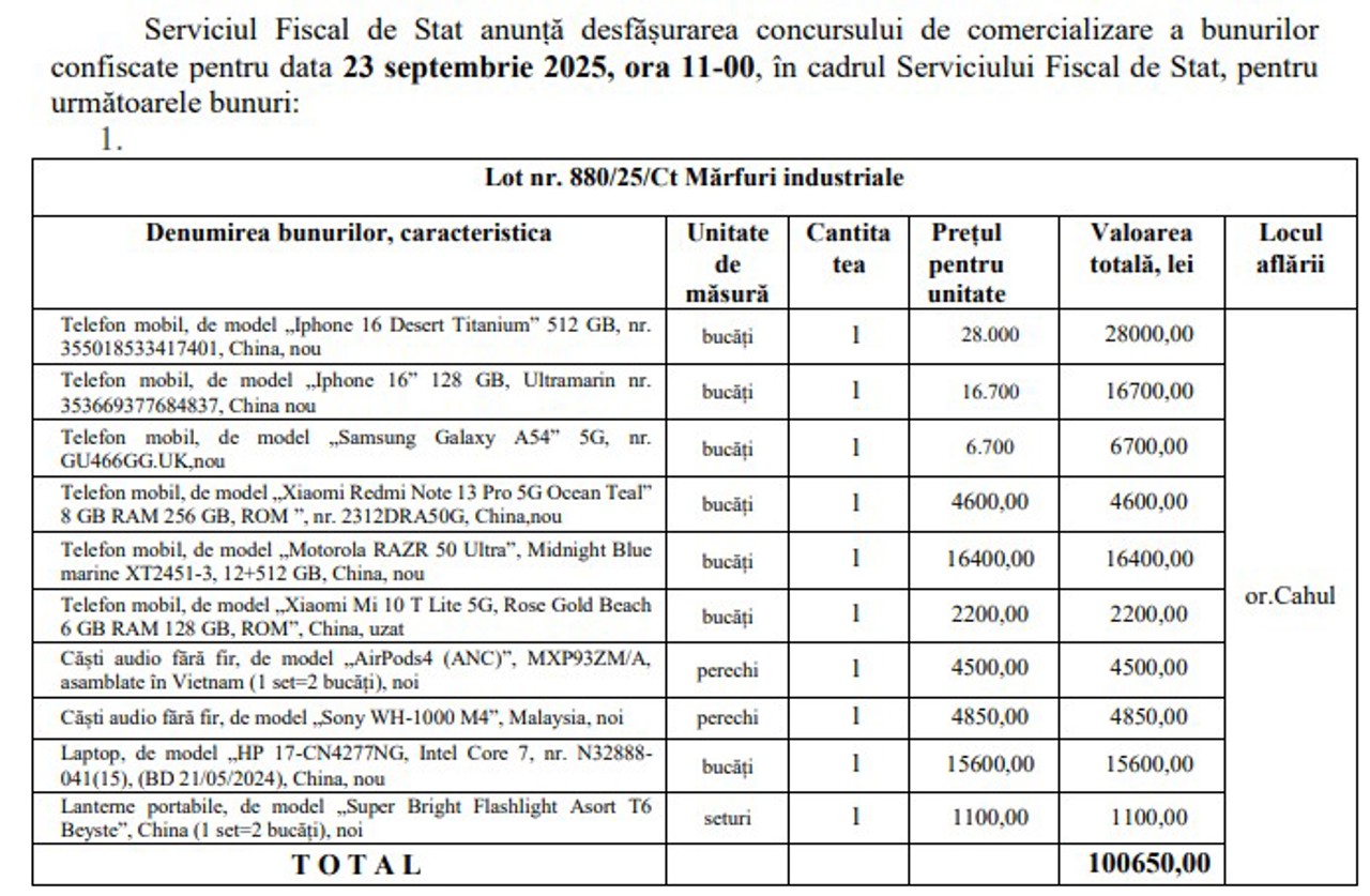 Printre bunurile scoase la mezat de fisc se numără un autoturism „Kia Soul” propus la prețul de 103.7 mii de lei sau circa 5.3 mii de euro, telefoane ce costă între 2.200 și 28.000 de lei, cauciucuri și roți auto cu prețuri între 3.200 și 14.800 de lei, dronă cu 6.900 de lei, laptop cu 15.600 de lei etc.