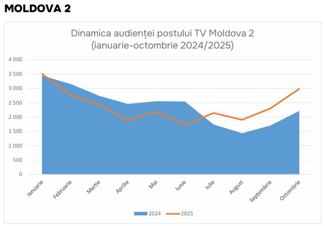 Publicul principal al Moldova 2 este format în proporție de 67% din persoane de peste 60 de ani, iar canalul își consolidează poziția în mediul rural și în regiunile de centru și sud.