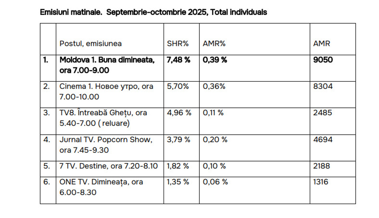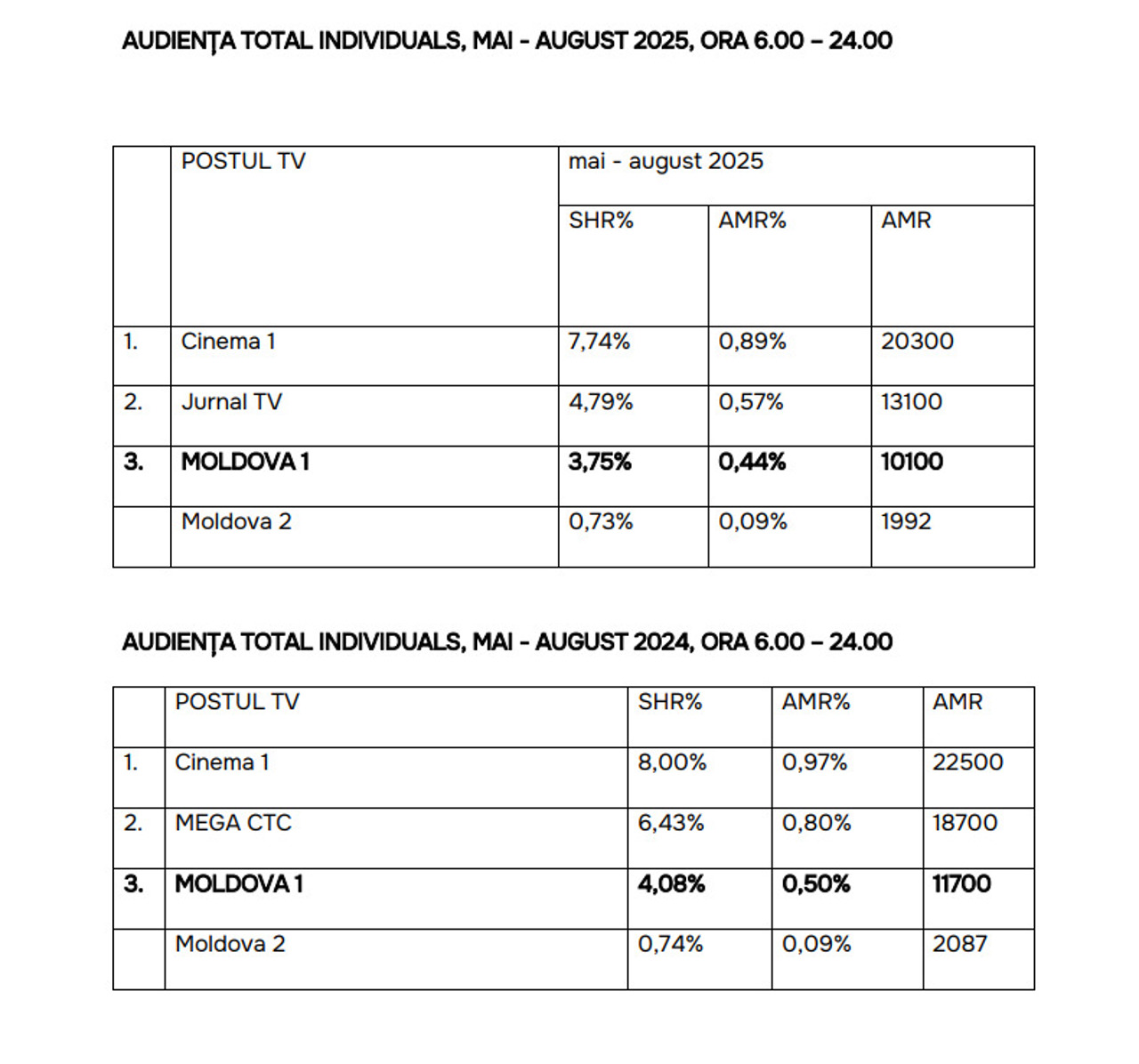 Potrivit aceleiași măsurări, postul Moldova 1 a ocupat, în perioada ianuarie - octombrie 2025, locul III în topul televiziunilor din Republica Moldova, după Cinema 1 și Jurnal TV, cu o cotă medie de piață (SHR) de 3.79%. În aceeași perioadă a anului 2024, Moldova 1 ocupa poziția a șaptea în același top.