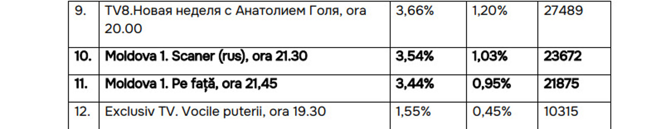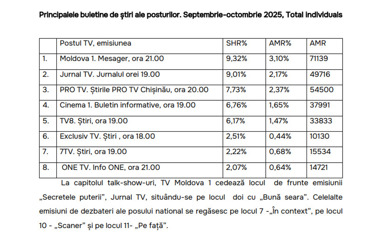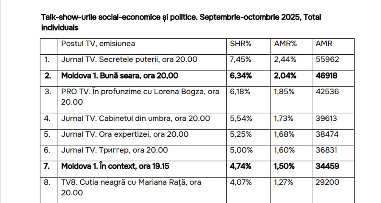 Also, in the top of political talk shows, "Buna Seara" (6.34% SHR) on Moldova 1 TV is immediately after "Secretele puterii" from Jurnal TV.