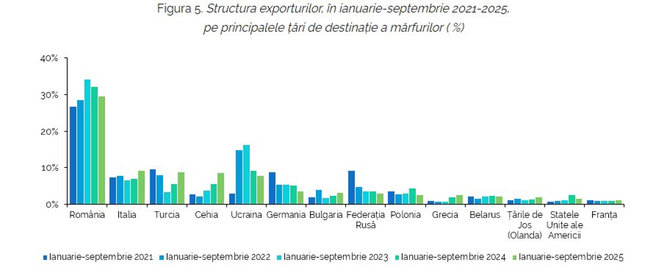 Creșteri semnificative au fost înregistrate la exporturile către Turcia, Cehia, Italia, Bulgaria, Grecia și Țările de Jos, în timp ce exporturile către România, Polonia, Ucraina, Germania și Statele Unite au scăzut.