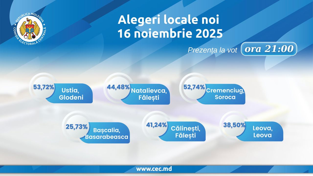 Duminică, 16 noiembrie, cetățenii cu drept de vot din șase localități din țară au fost așteptați la urnele de vot pentru a-și alege primarii, iar în unele localități și o nouă componență a consiliului local. Alegeri locale au fost desfășurate în satul Ustia, raionul Glodeni, comuna Natalievca, raionul Fălești, comuna Cremenciug, raionul Soroca, satul Bașcalia, raionul Basarabeasca, comuna Călinești, raionul Fălești și orașul Leova, raionul Leova.