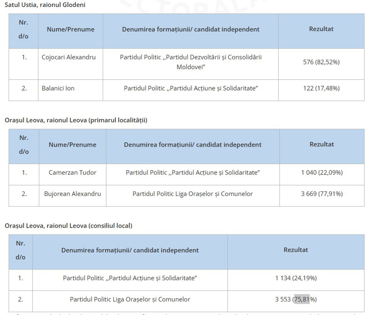 In the village of Ustia, in the Glodeni district, the PDCM representative won with 82.52% of the vote. Meanwhile, in the city of Leova, the LOC representative secured victory with 77.91%. Both candidates defeated their opponents from the Action and Solidarity Party.