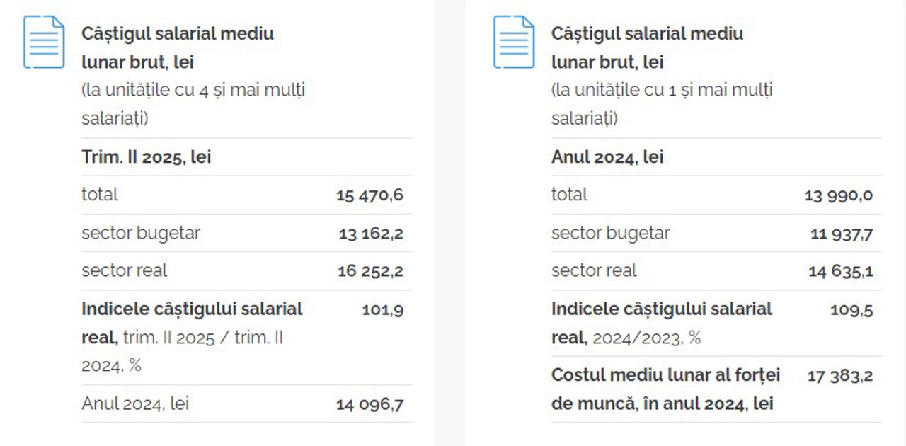 Potrivit Biroului Național de Statistică, salariul mediu din R. Moldova a fost, în anul 2024, de 13.990 de lei sau circa 682 de euro. În trimestrul al doilea din anul curent, salariul mediu lunar a urcat la 15.470 de lei, echivalentul a circa 788 de euro.