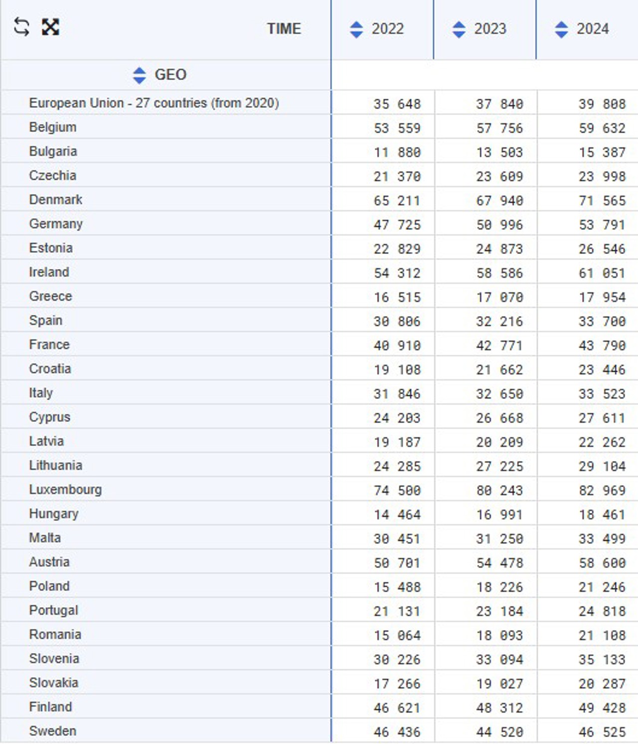 Printre țările UE cu cel mai mare salariu mediu anual ajustat cu normă întreagă se mai numără Danemarca - 5.966 de euro lunar sau 7.600 de euro anual, precum și Irlanda – 61.100 de euro în 2024.