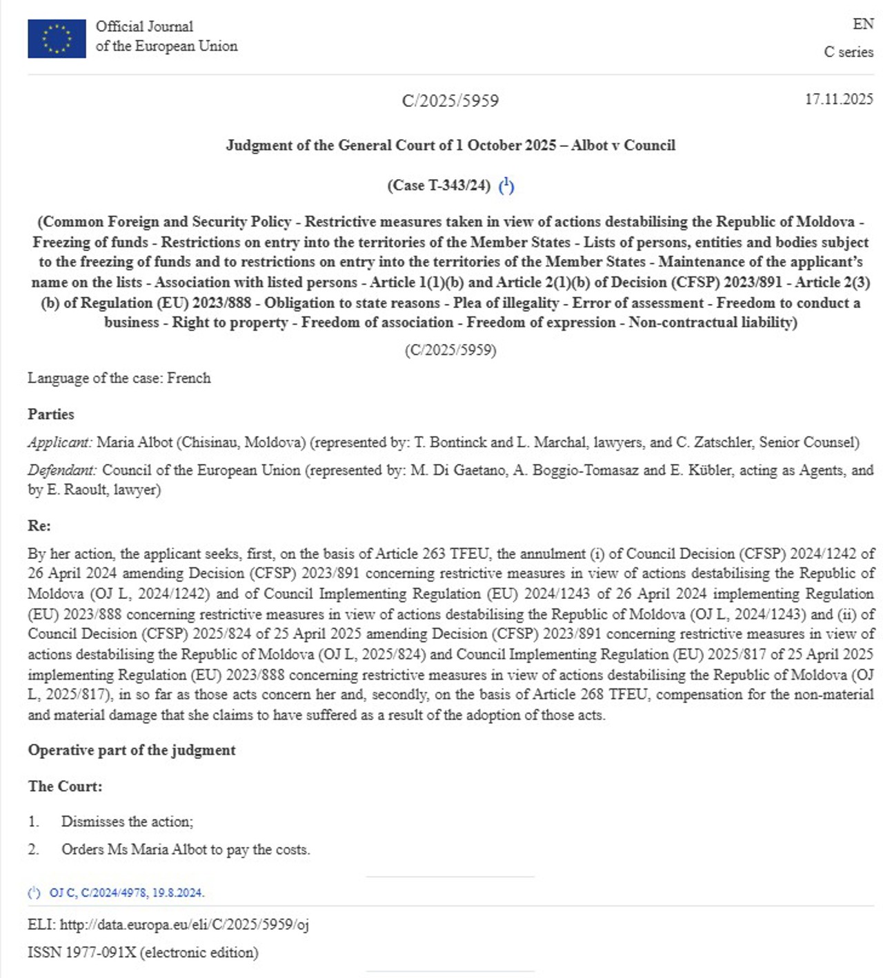 Astfel, hotărârea instanței, pronunțată pe 1 octombrie curent, dar făcută publică pe 17 noiembrie, confirmă interdicția pentru Maria Albot de a intra sau de a tranzita teritoriul oricărui stat membru al UE și menține înghețarea tuturor fondurilor și resurselor economice care îi aparțin.