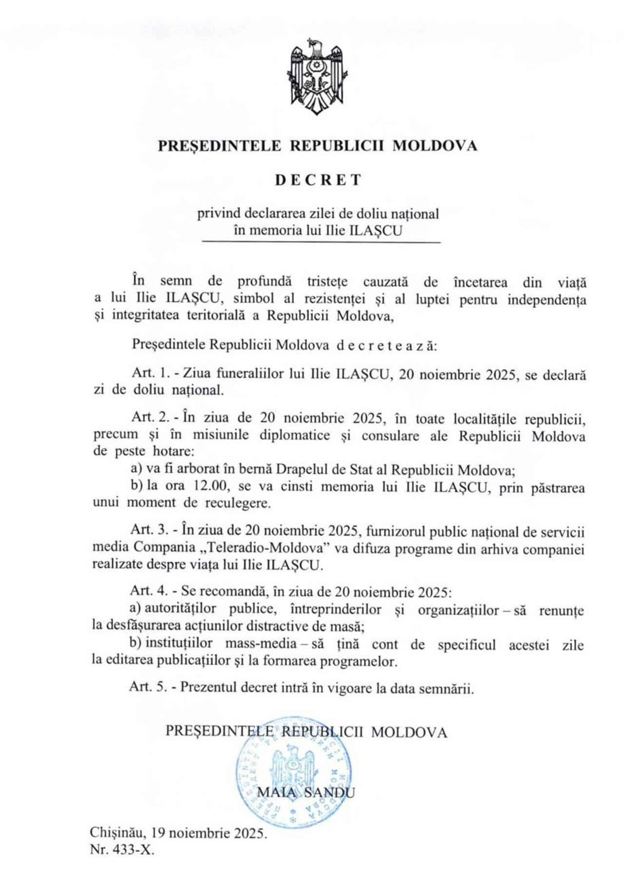 20 ноября в Молдове объявлен день национального траура в память о бывшем политзаключённом сепаратистского режима Илие Илашку. Похороны пройдут в четверг в Бухаресте. В этот же день в столичном Национальном дворце с 10:00 до 13:00 пройдет символическая акция прощания.