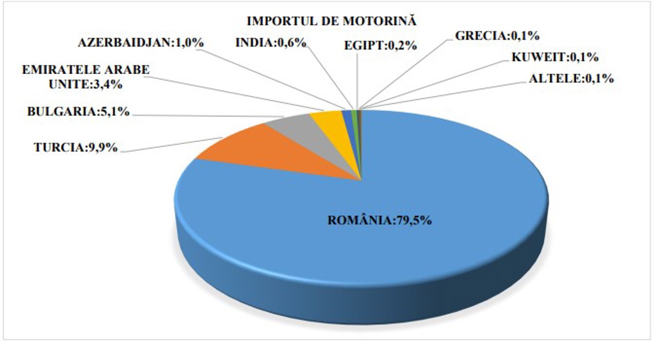 For diesel fuel, Romania supplied 79.5% of the imported quantity, followed by Turkey, Bulgaria, and the United Arab Emirates.