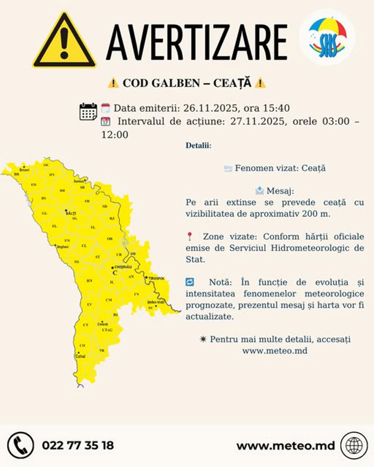 The State Hydrometeorological Service has issued a Yellow Fog Code for Thursday, November 27, valid from 03:00 to 12:00. Meteorologists predict that dense fog will cover large areas, reducing visibility to approximately 200 meters.