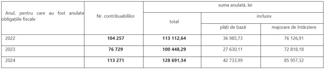 Suma totală a obligațiilor fiscale anulate este de 28.3 mii de lei, dintre care 4.2 mii de lei reprezintă plăți de bază. Restul sumei constă în majorări de întârziere și amenzi, aferente unui număr de 15.9 mii de contribuabili.