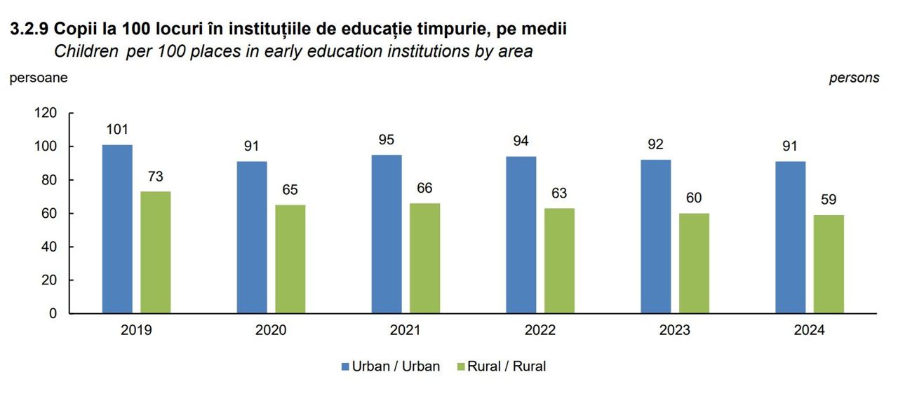 În mediul urban, grădinițele sunt încă aglomerate (91 de copii la 100 de locuri), în timp ce în mediul rural sunt folosite doar pe jumătate - 59 de copii la 100 de locuri.