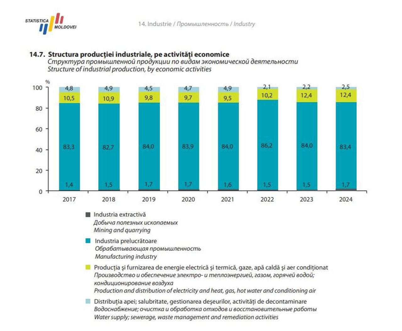 La nivel național, industria prelucrătoare generează peste 83% din producția industrială, confirmând că economia Moldovei se bazează în principal pe procesare, nu pe extracție.
