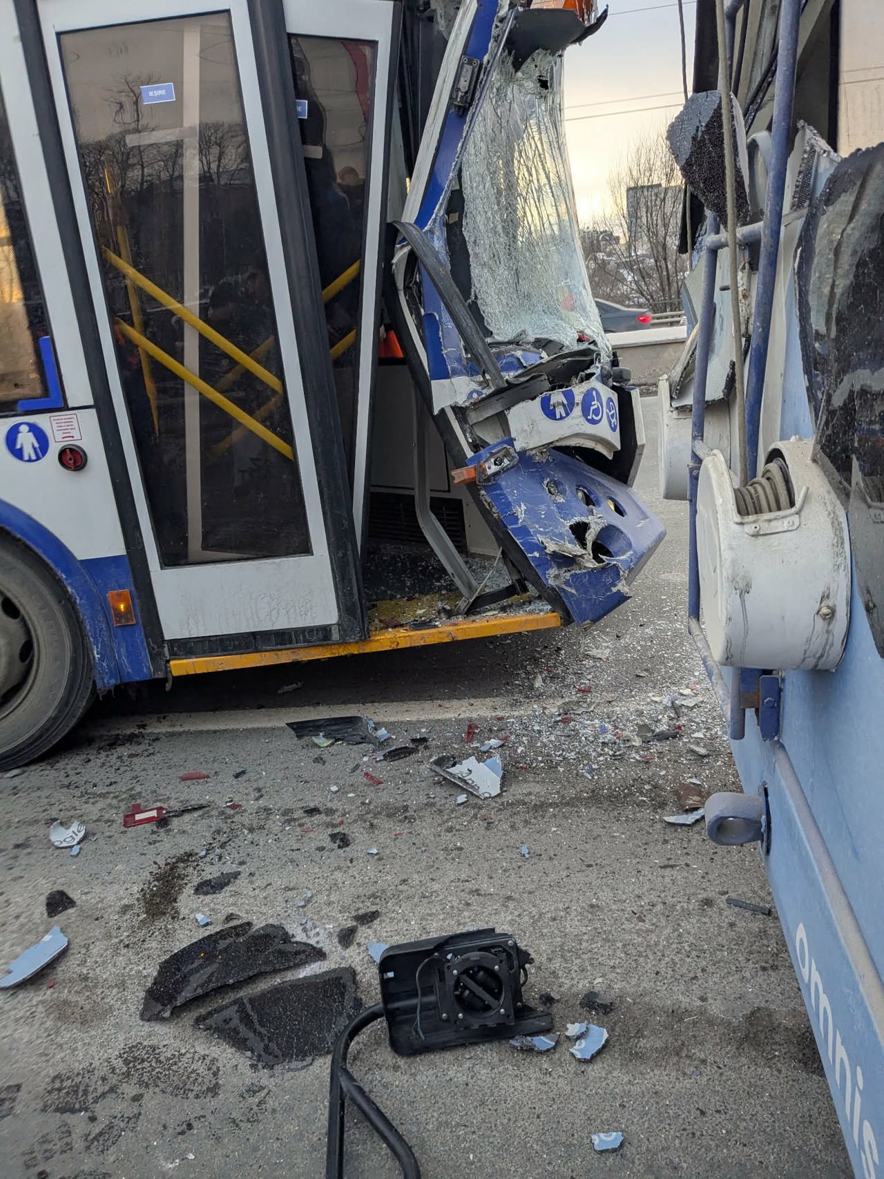 Din imagini se vede că ambele troleibuze au fost grav avariate.