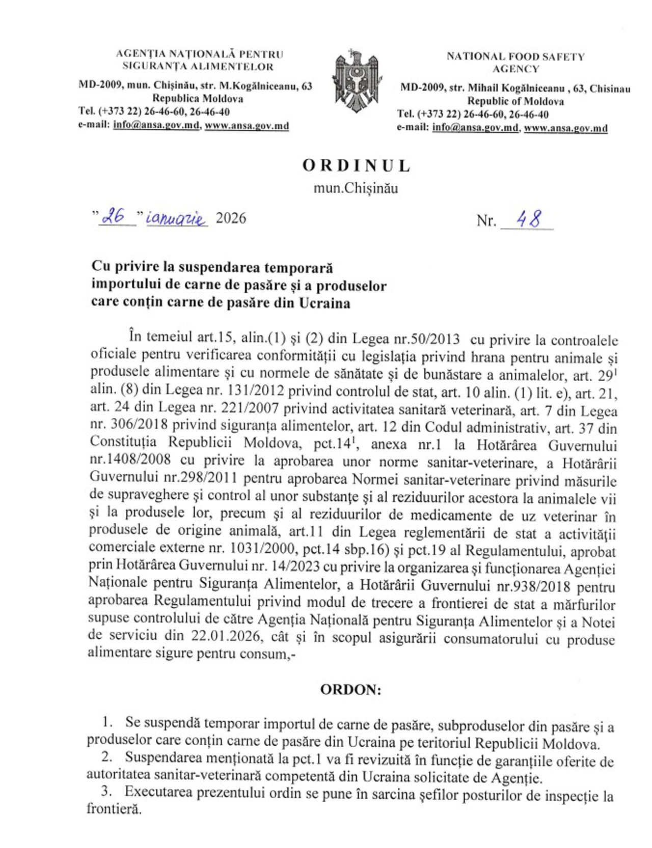 R. Moldova suspendă temporar importul de carne de pasăre și produse derivate din carne de pasăre din Ucraina. Ordinul a fost semnat luni, 26 ianuarie, de directorul Agenției Naționale pentru Siguranța Alimentelor (ANSA), Radu Musteața, și va intra în vigoare după publicarea acestuia în Monitorul Oficial.