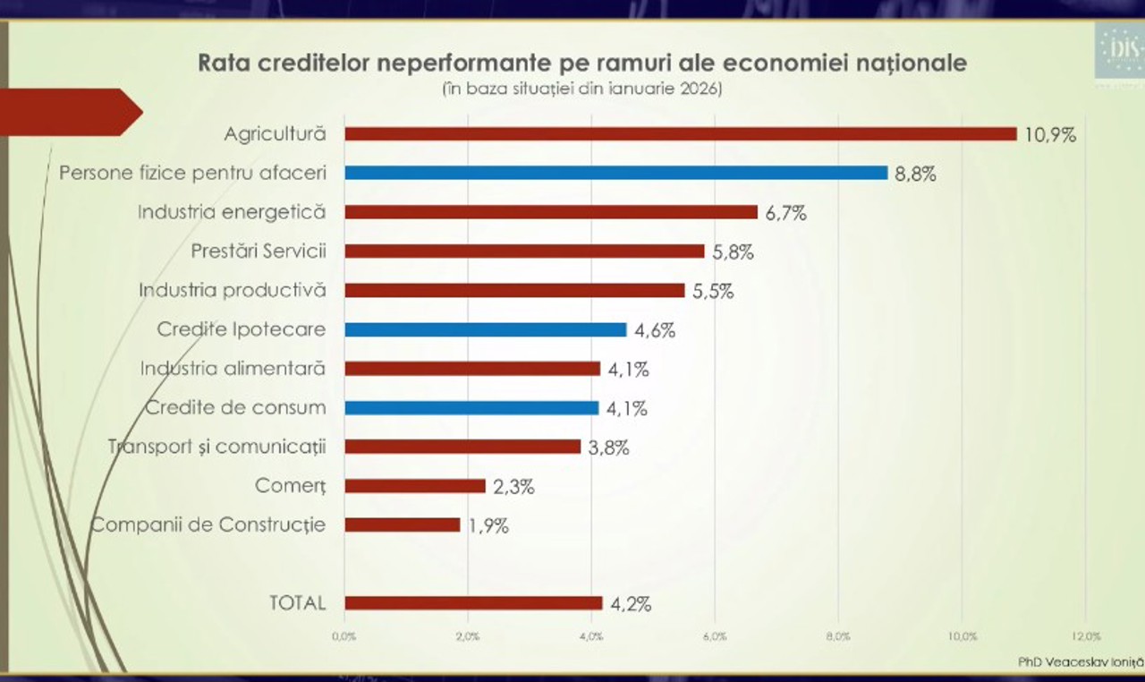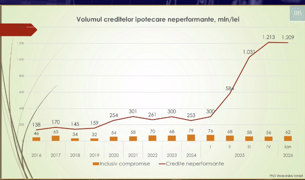 Datele arată că, pentru prima dată, creditele ipotecare au devenit mai riscante decât media din sistem. Dacă în 2024 doar 1.5% dintre ele erau neperformante, în ianuarie 2026 procentul a crescut la 4.6%. În plus, aproape 18% dintre aceste credite înregistrează întârzieri la plată. Cu alte cuvinte, tot mai mulți debitori întârzie sau nu reușesc să-și achite la timp obligațiile, a menționat Veaceslav Ioniță.