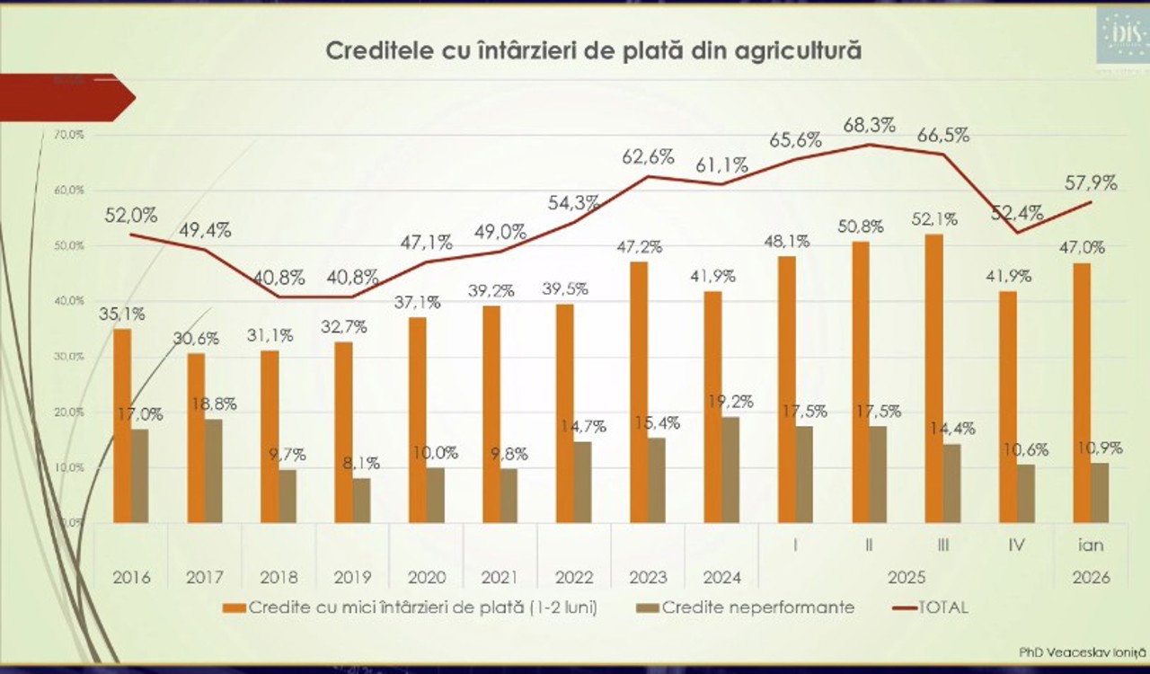 Un sector vulnerabil rămâne agricultura. Aici se înregistrează cele mai multe probleme la rambursarea creditelor. Aproape 11% dintre împrumuturile acordate agricultorilor sunt neperformante, iar mai mult de jumătate dintre credite sunt plătite cu întârziere.