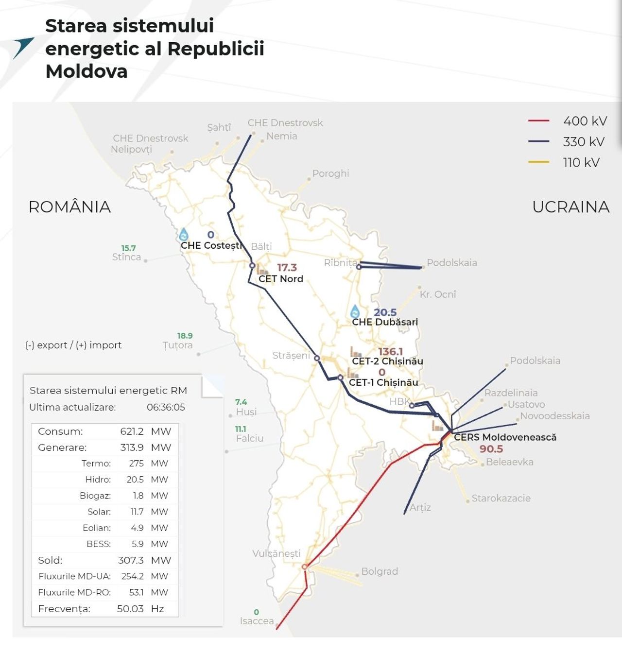 Consumatorii din Republica Moldova sunt asigurați cu energie electrică produsă din surse interne și datorită importurilor pe rute alternative, inclusiv pe cele patru linii electrice de 110 kV cu România. Acestea au fost testate încă în vara anului trecut în eventualitatea unor astfel de situații și și-au demonstrat eficiența inclusiv în timpul blackoutului parțial din 31 ianuarie.