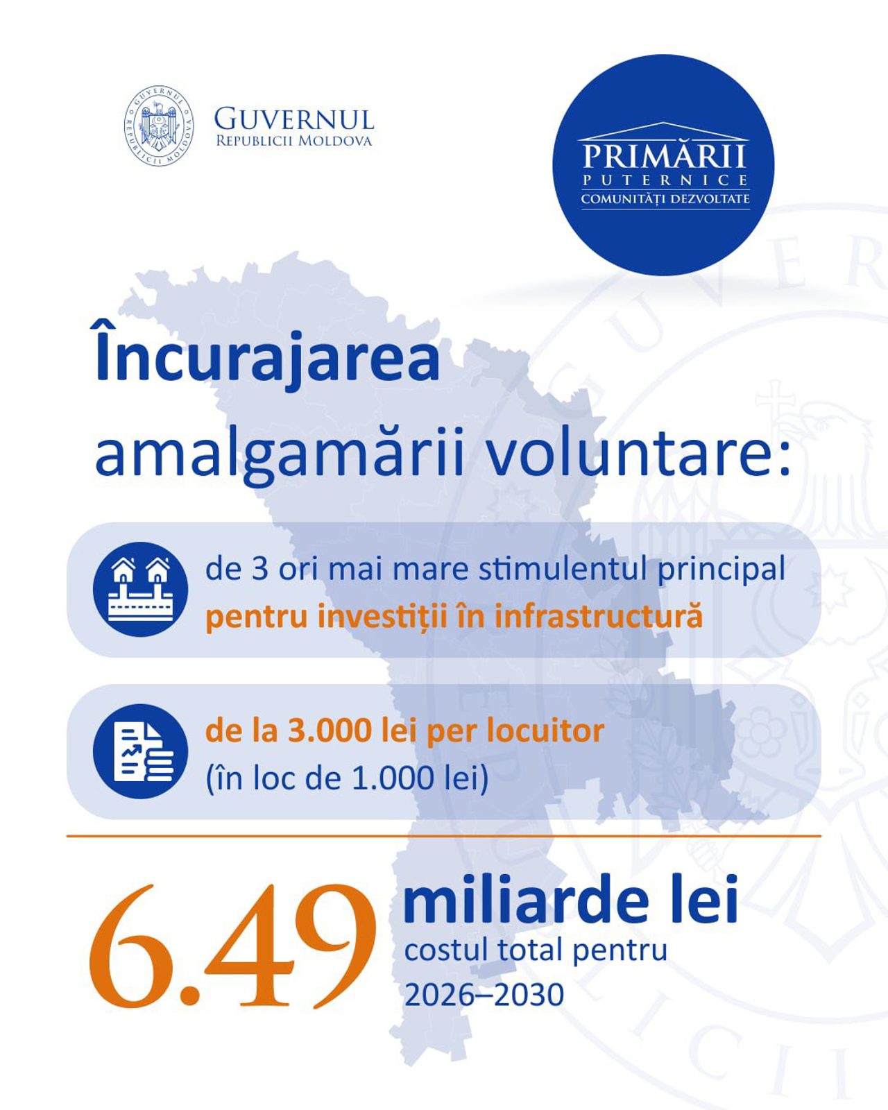 Pentru localitățile care decid să se unească, sprijinul principal pentru investiții în infrastructură va fi triplat, de la 1.000 la 3.000 de lei pentru fiecare locuitor.