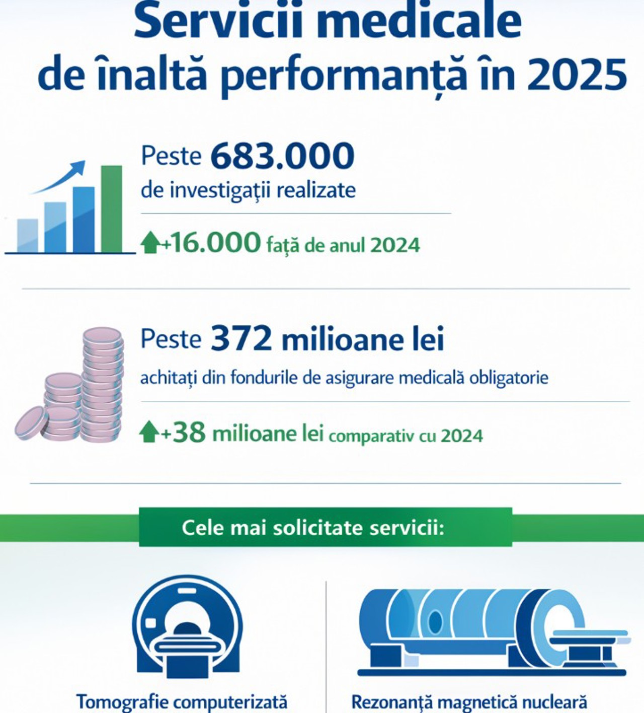 Menționăm că, investigațiile de înaltă performanță sunt accesibile fără plată numai persoanelor asigurate. Pentru a beneficia de acestea, este necesară programarea în Sistemul informațional de raportare și evidență a serviciilor medicale.