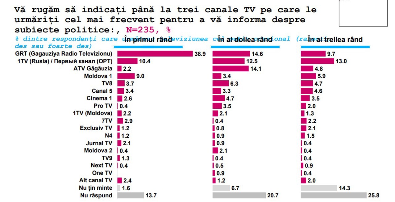 Principalele canale TV urmărite pentru informații politice sunt GRT (Gagauziya Radio Televizionu) – 63%, 1TV Rusia – 36% și ATV Găgăuzia – 22%. Dintre posturile în limba română, cele mai vizionate sunt Moldova 1 – 18%, TV8 – 14% și Canal 5 – 12%.