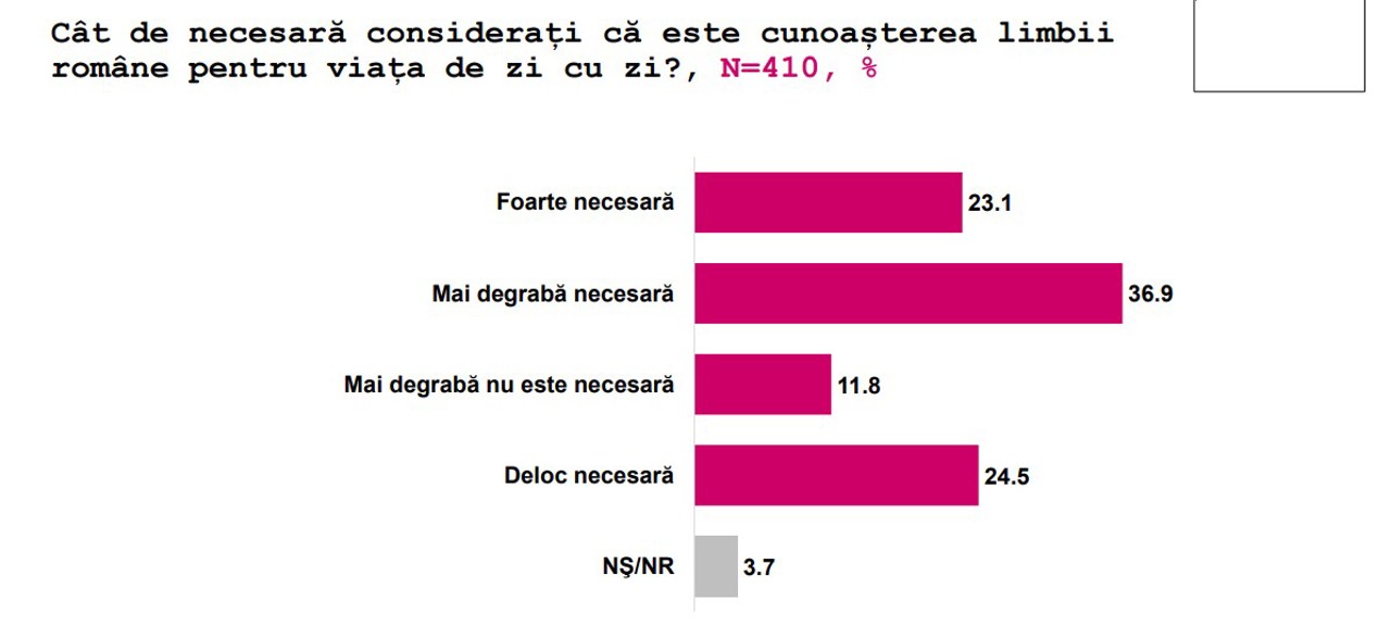 Cunoașterea limbii române nu este considerată obligatorie de 36% dintre respondenți, în timp ce 60% o consideră necesară în rutina zilnică.
