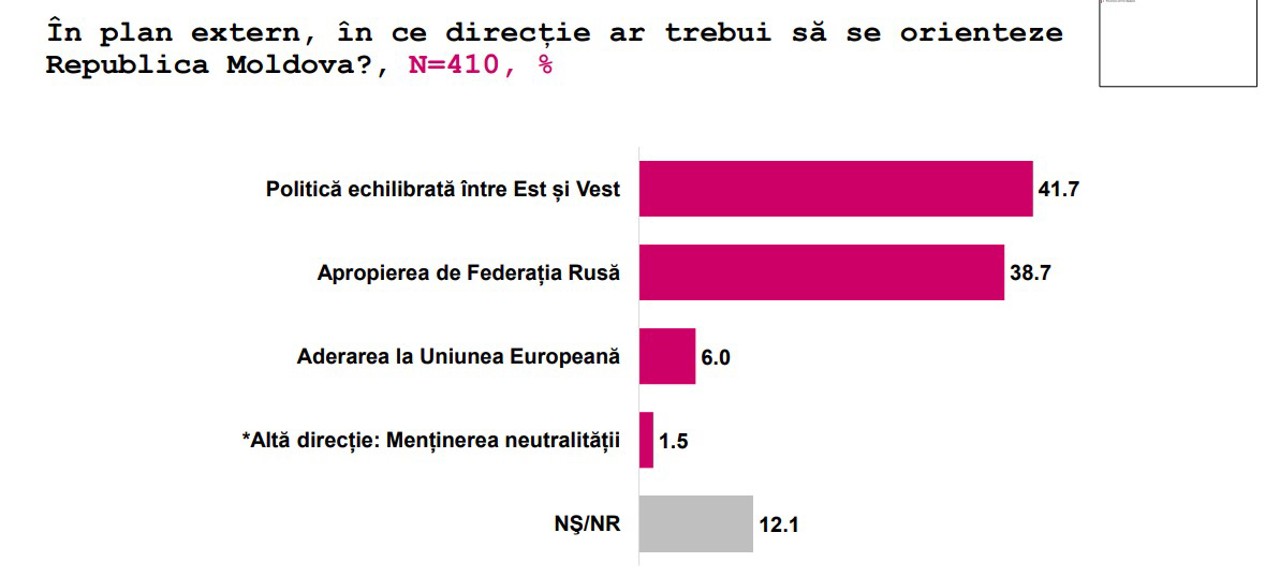 Sondajul relevă o discrepanță semnificativă în privința direcției geopolitice a țării: apropierea de Federația Rusă este susținută de 39% dintre respondenți, în timp ce integrarea în UE este salutată de doar 6%.