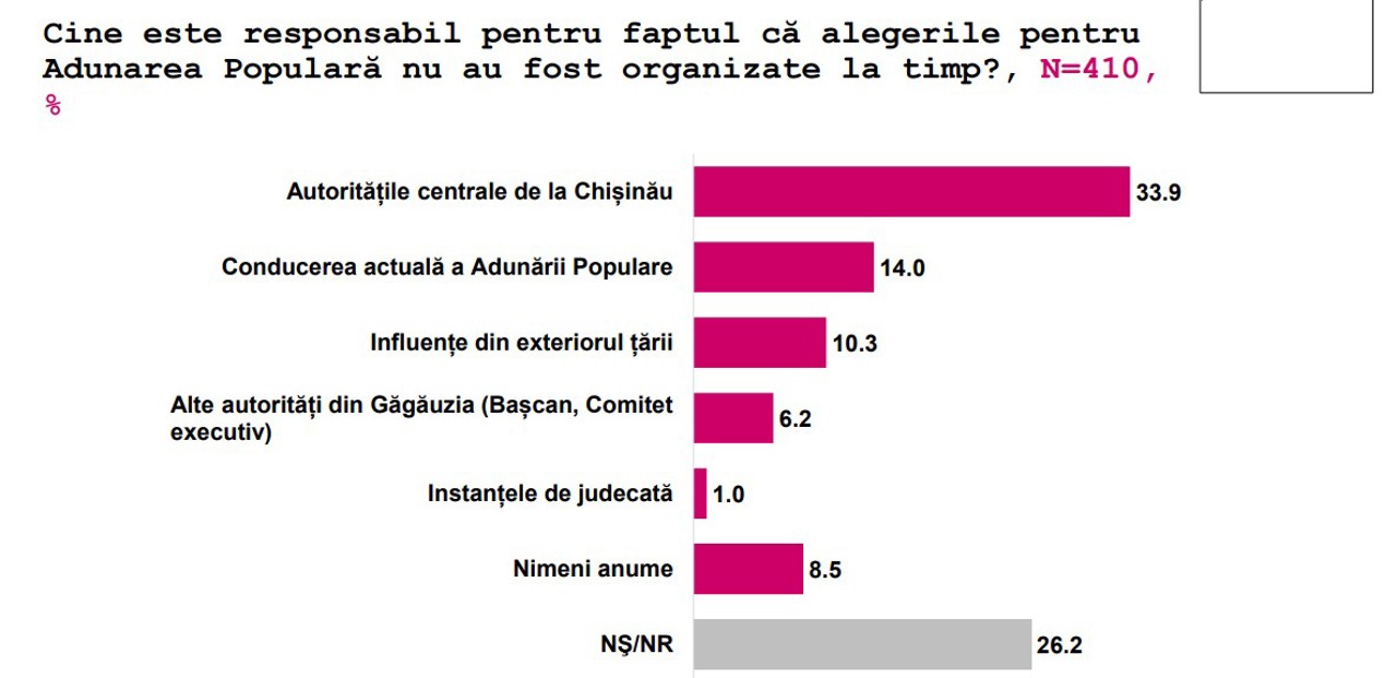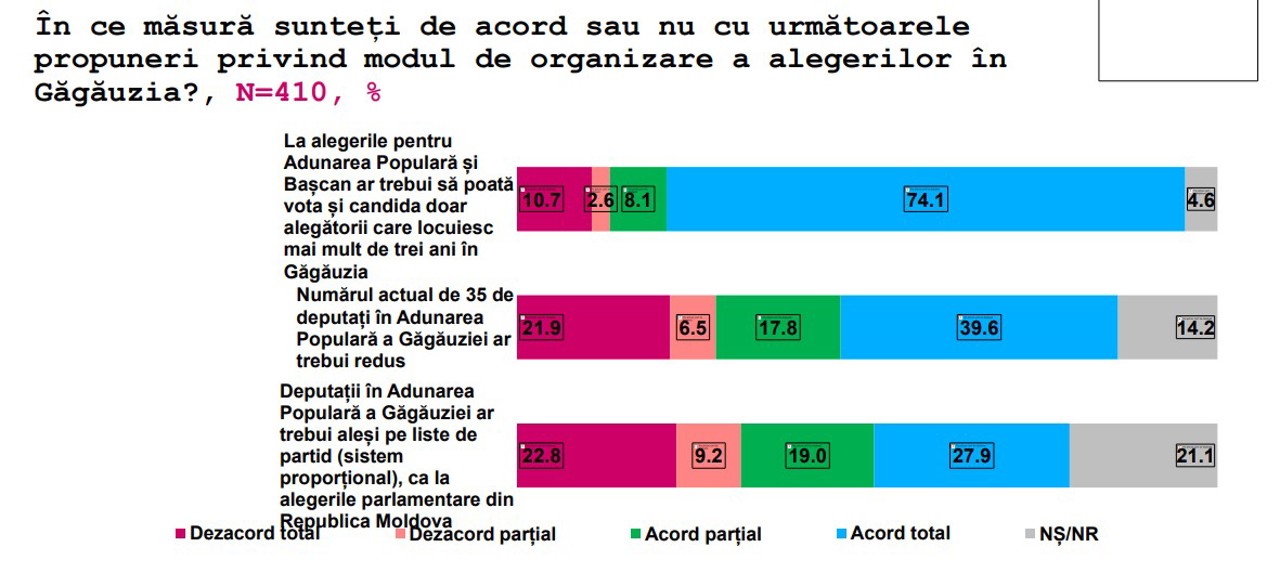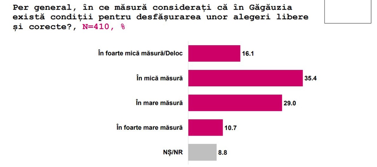 Potrivit studiului, circa 40% dintre respondenți consideră că în UTA Găgăuzia există condiții care ar asigura organizarea unor alegeri libere și corecte, în timp ce peste 35% apreciază că actualele condiții sunt doar într-o mică măsură favorabile unui scrutin democratic.
