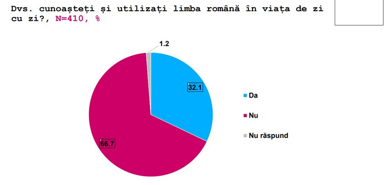 Totodată, 32% dintre intervievați declară că știu și folosesc limba română în activitatea zilnică, față de aproximativ 67% care nu o cunosc și nu o utilizează.