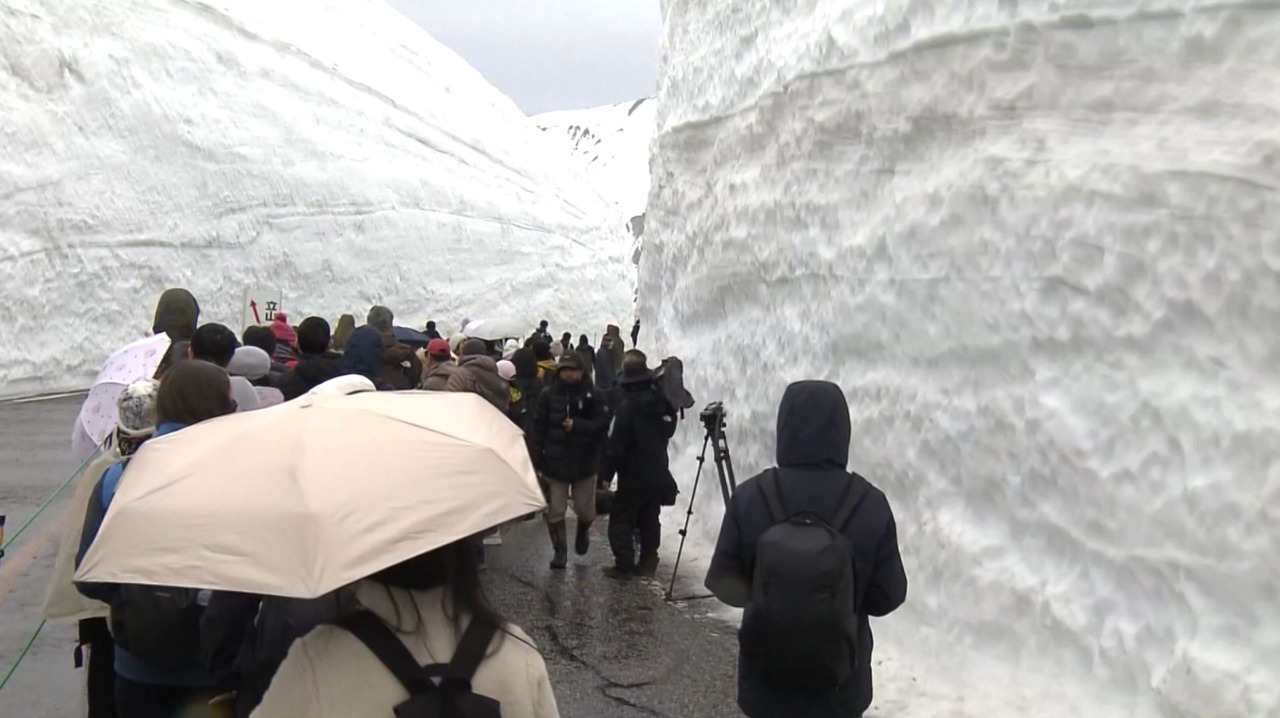 La mijloc de primăvară, turiștii s-au plimbat prin coridorul de zăpadă din Alpii Japonezi, la o altitudine de 2.450 de metri. În acest an, zidurile de zăpadă măsoară 12 metri înălțime, dar în alți ani, ajungeau la 20 de metru.